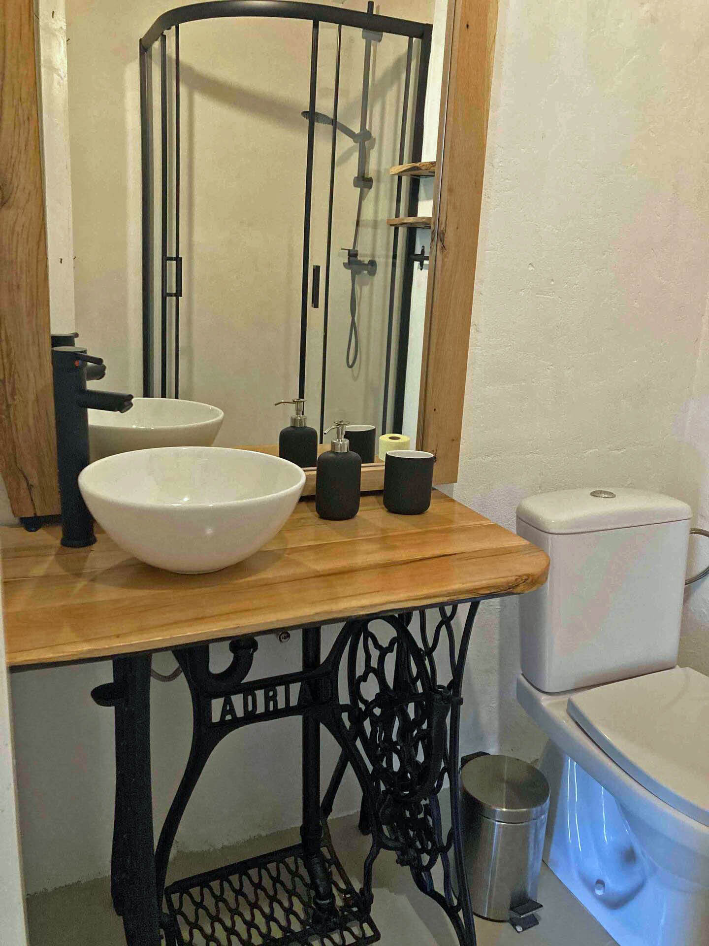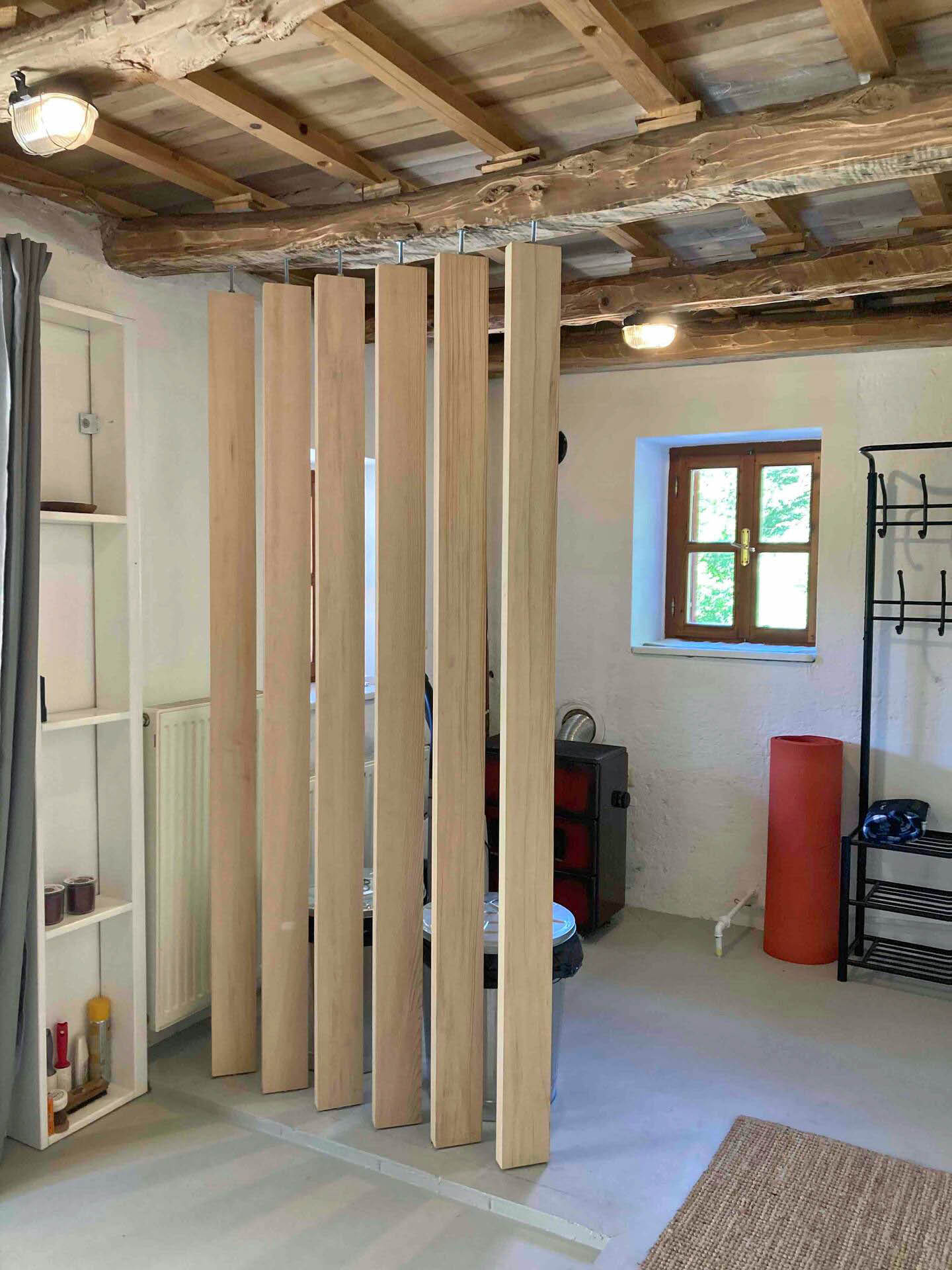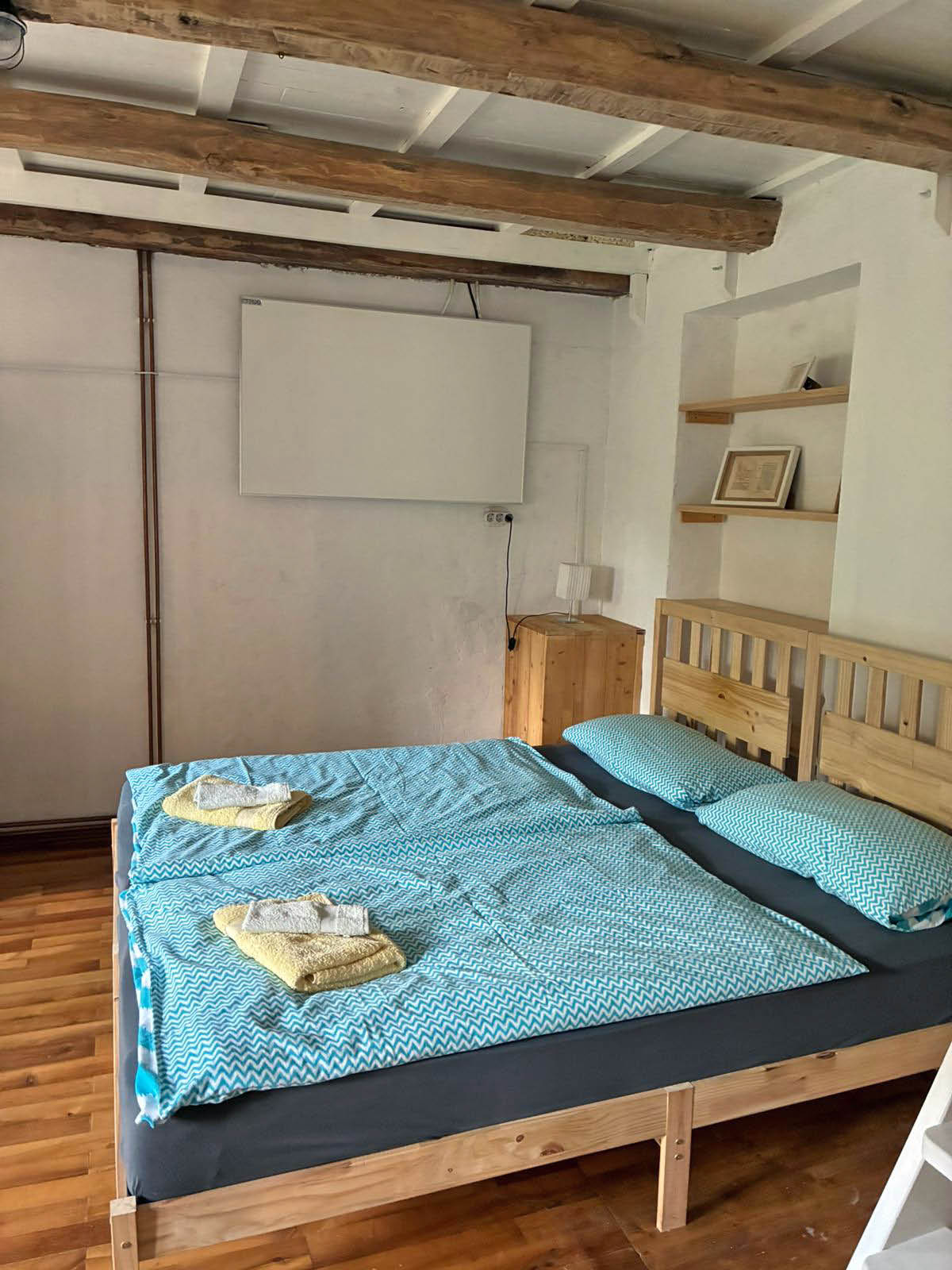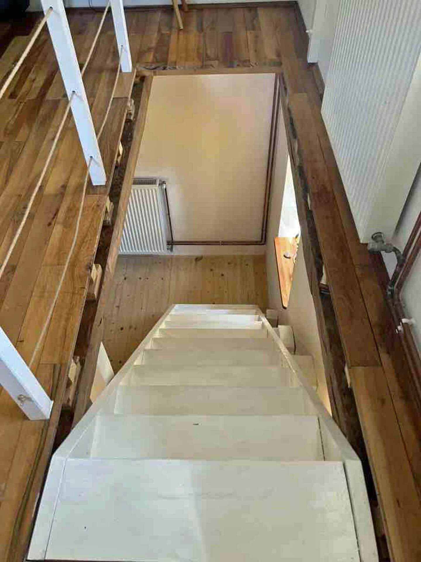 To the upper floor leads a wooden staircase, where there is a living room and additional bedroom.