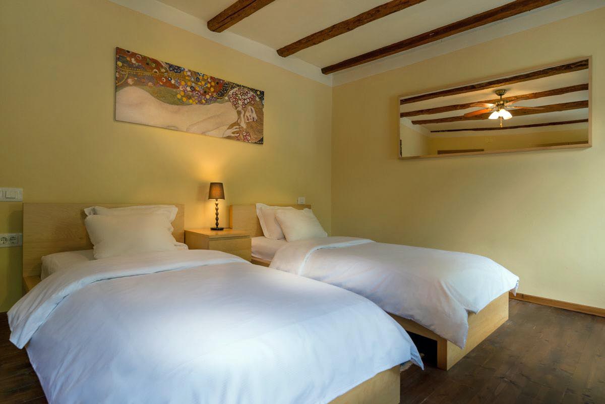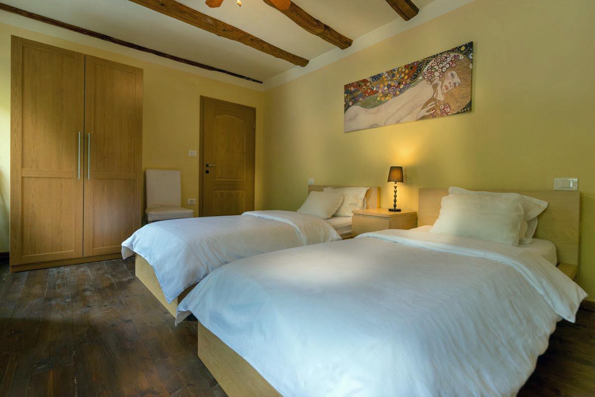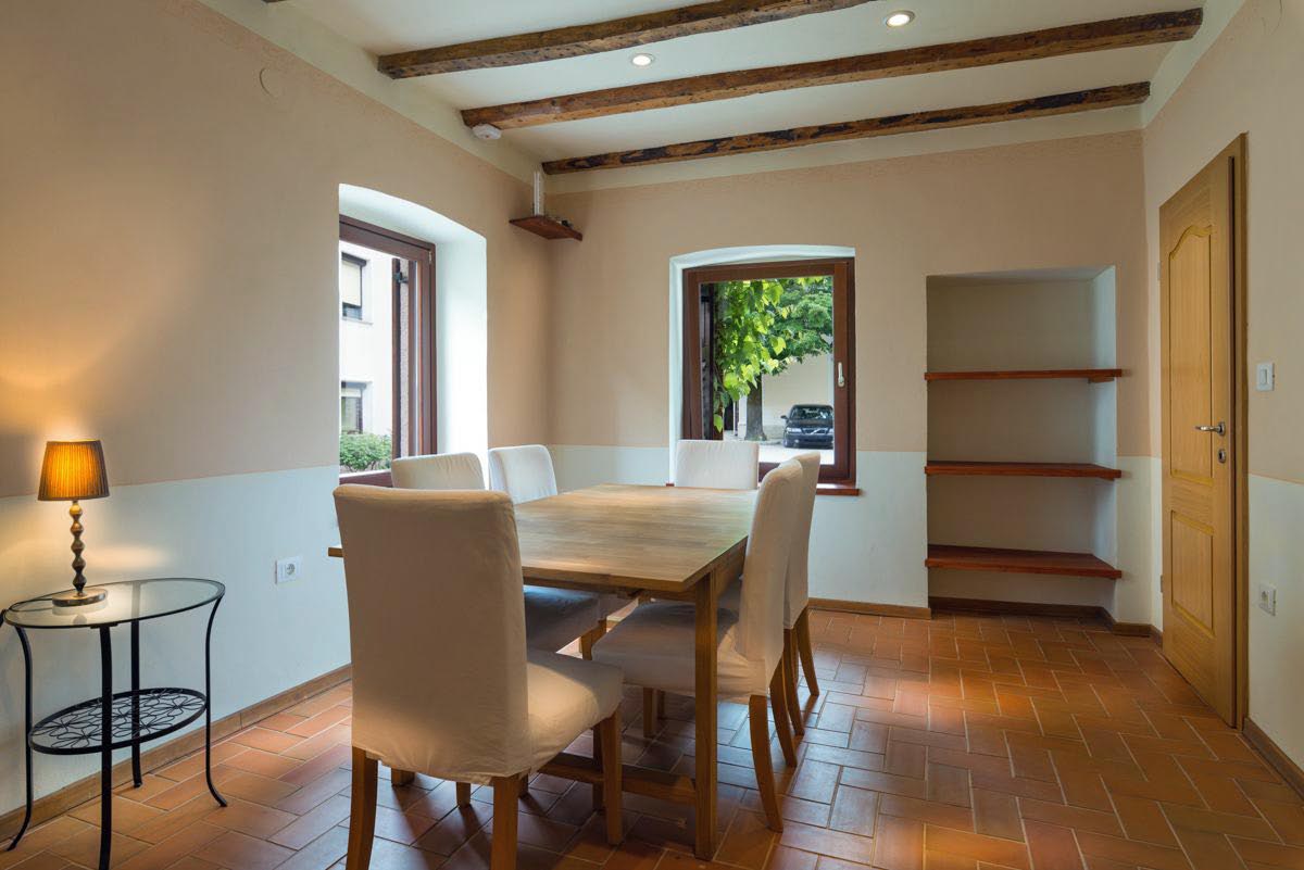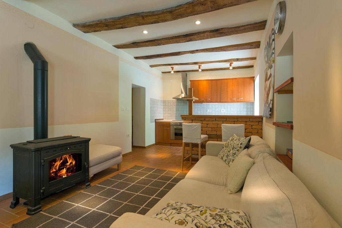 The property includes two bathrooms, a kitchen storeroom, and a cellar housing the heating system and offering additional storage space. The house retains its authentic character with stone structural walls and wooden double-glazed windows, while providing modern comfort. Heating is supplied by oil central heating.