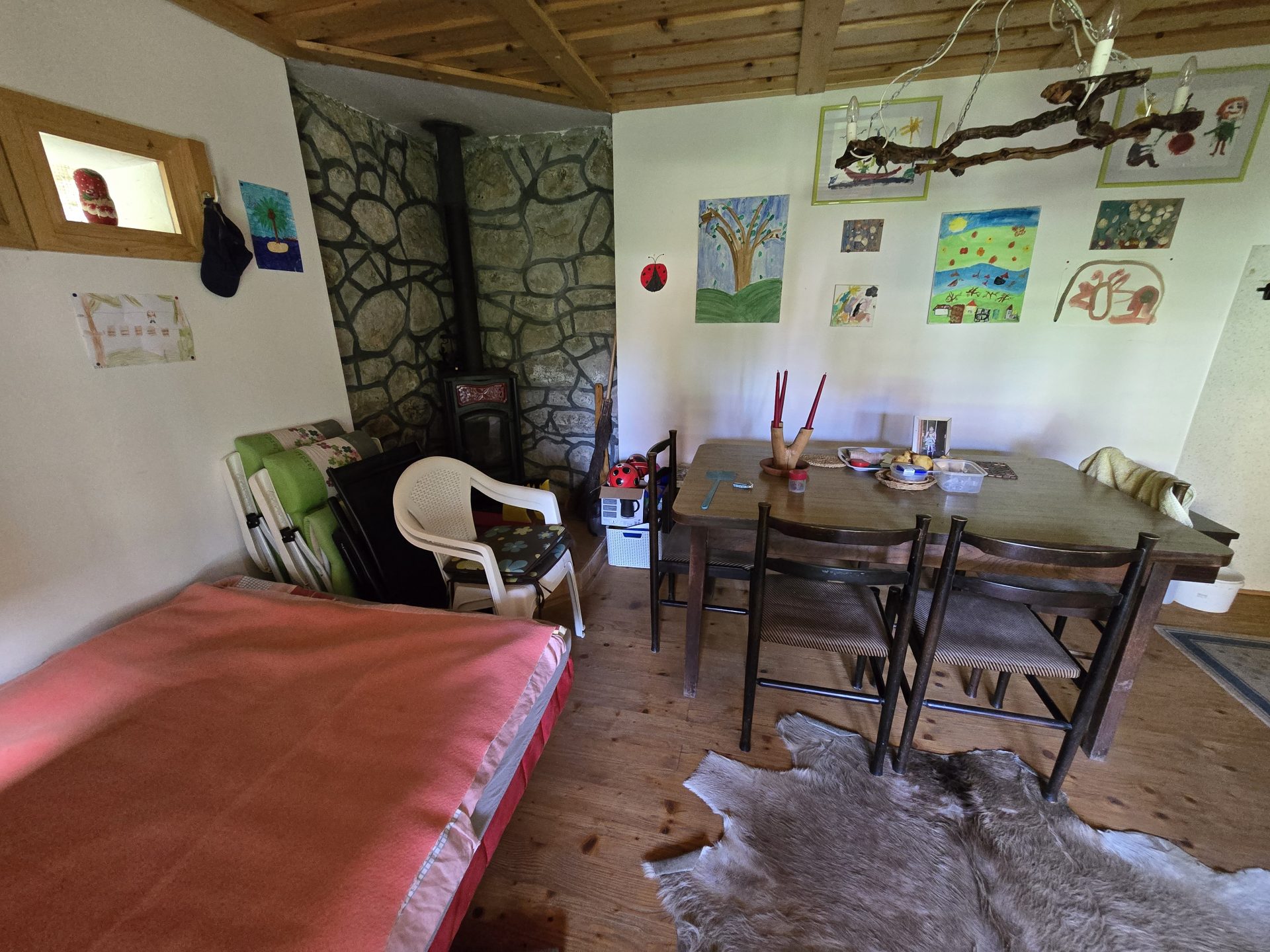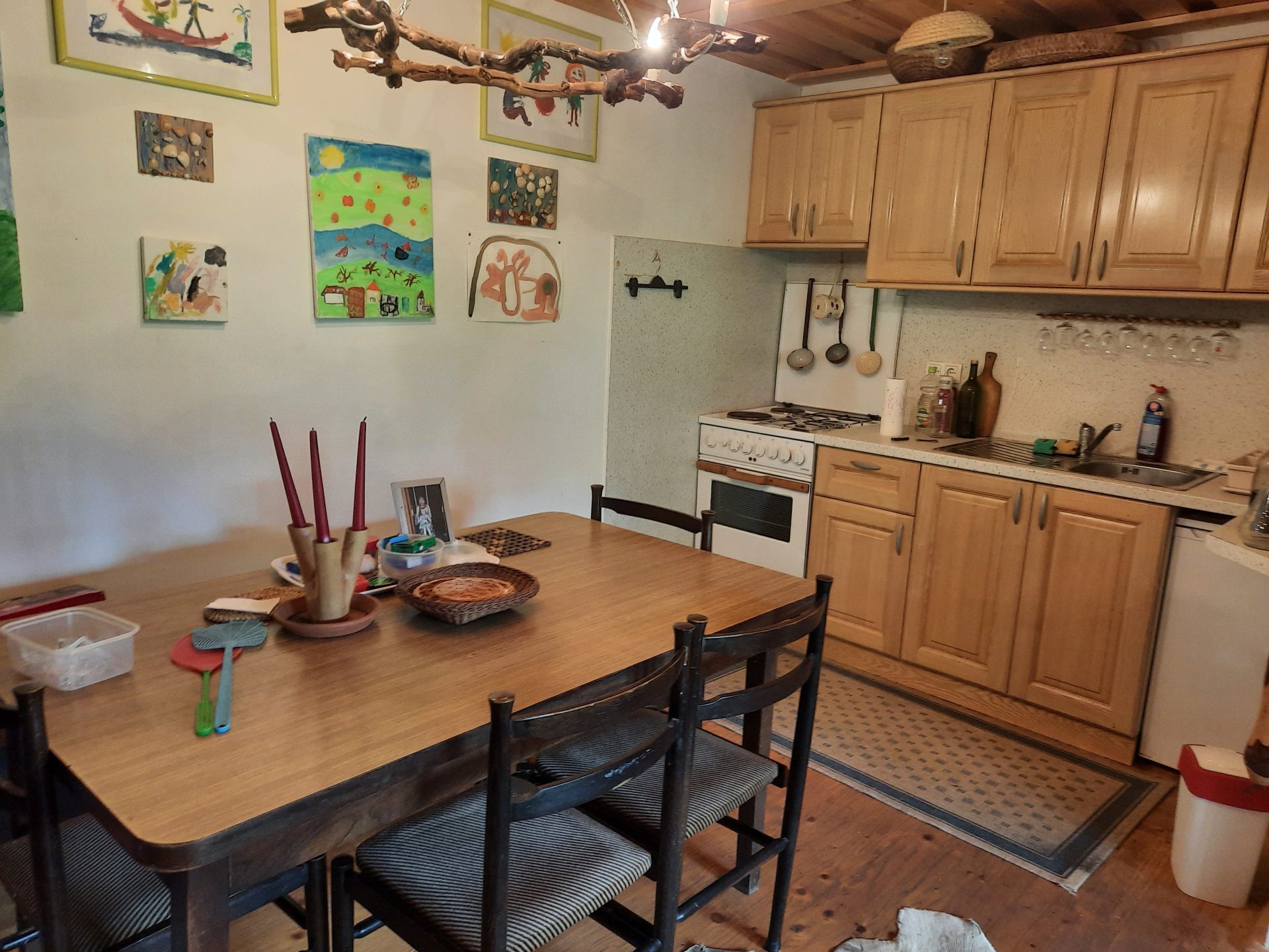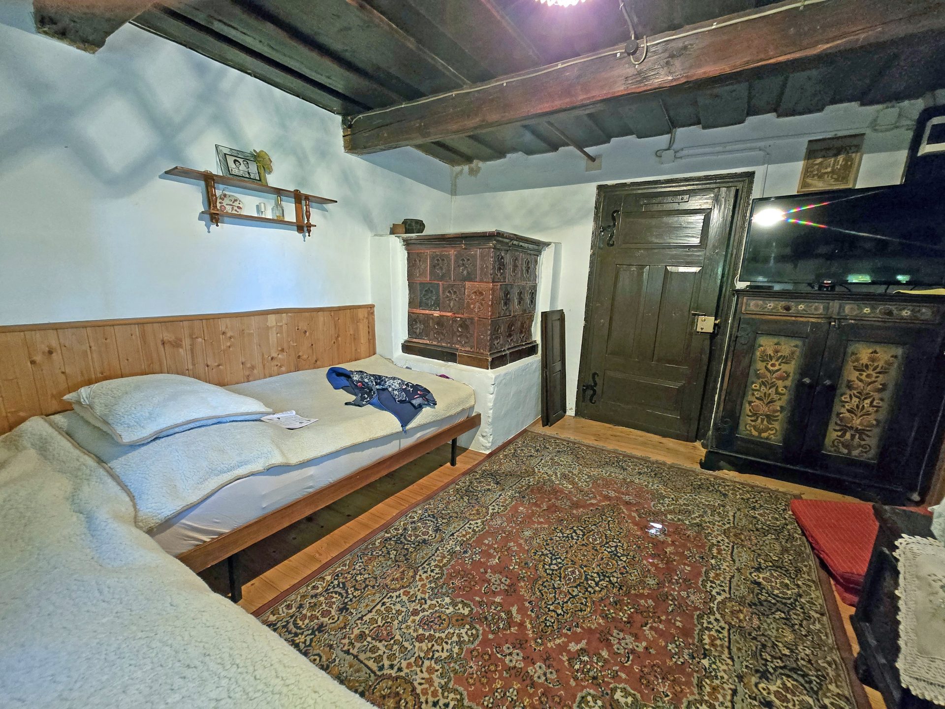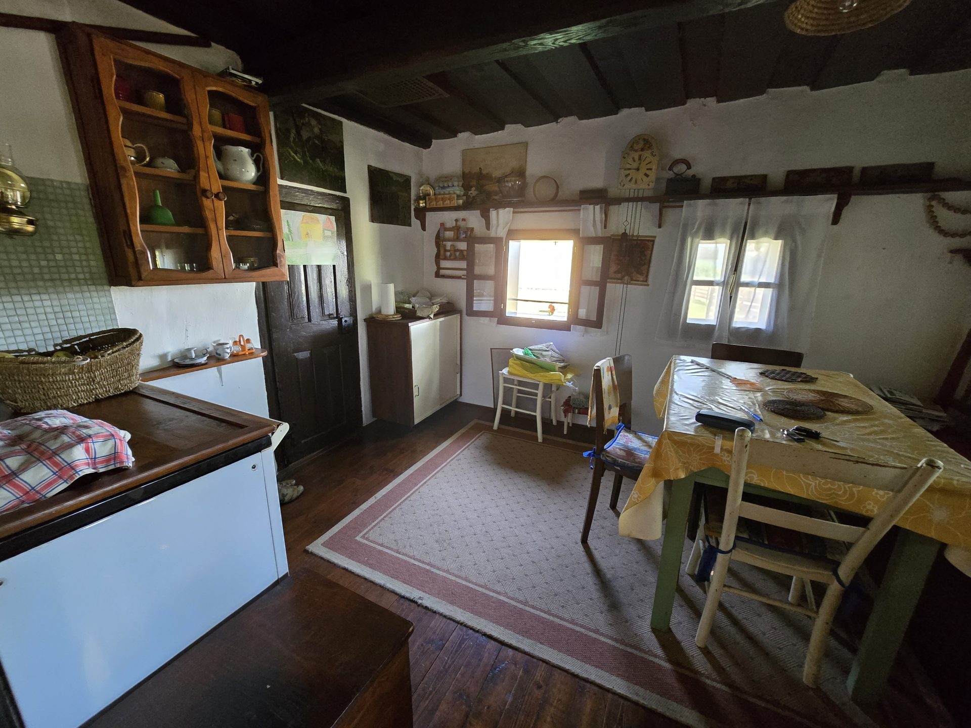The old house has a bedroom with a rustic stove, a small dining room with a wood stove, a hall with a small kitchen, a bathroom and two cellars.