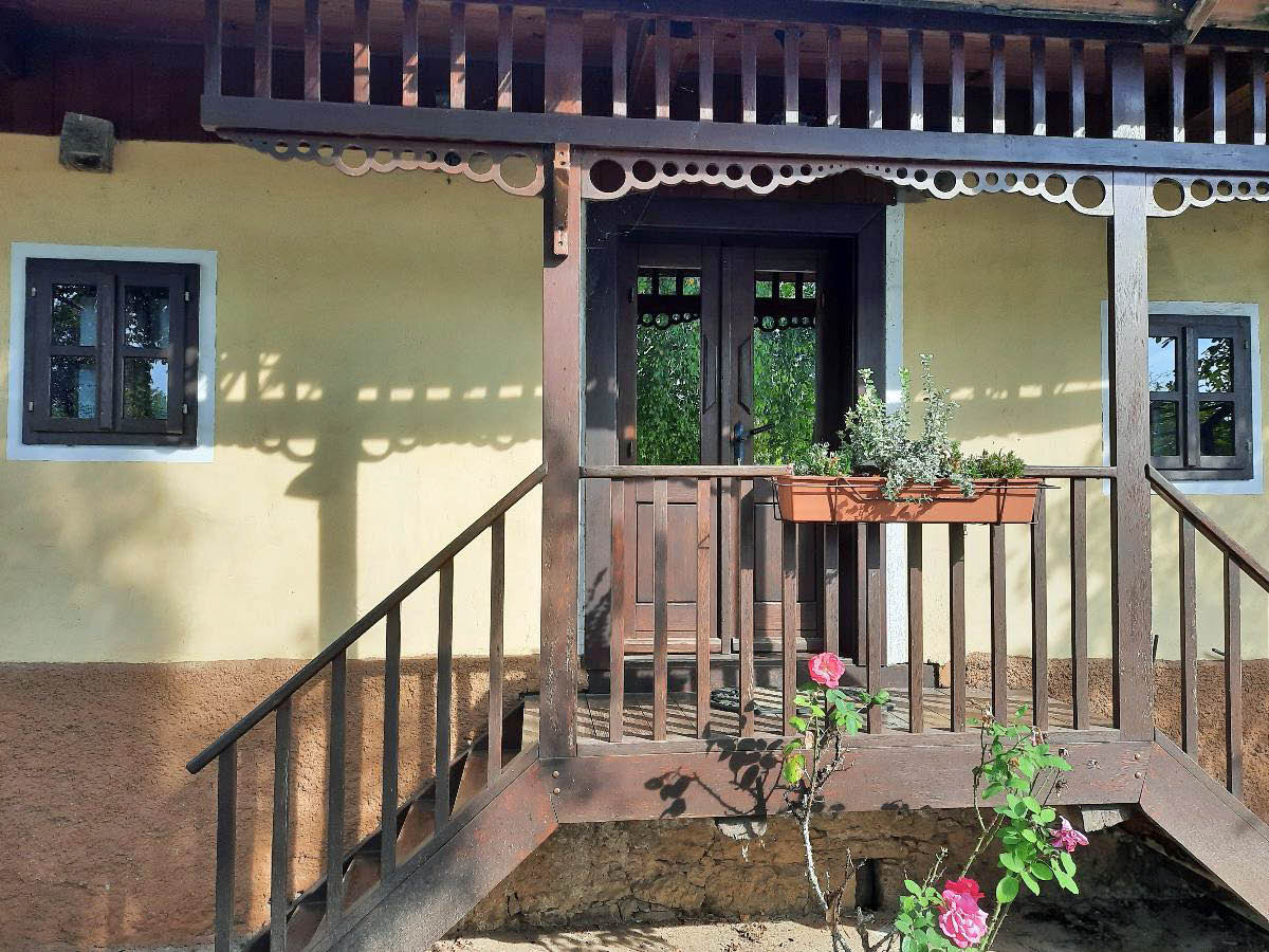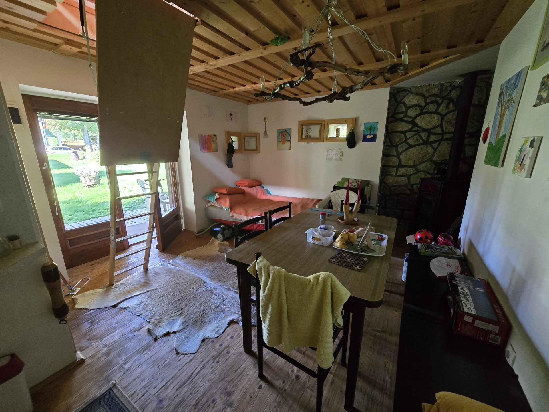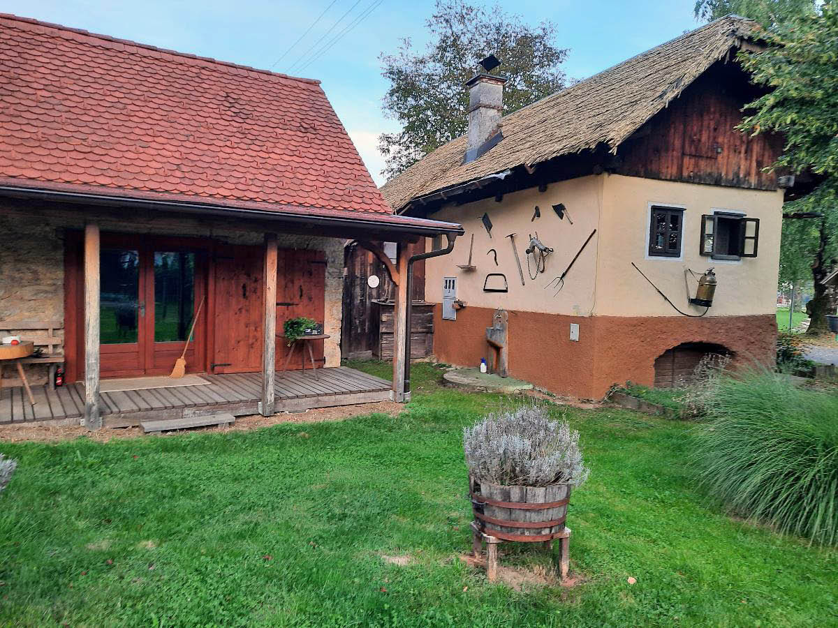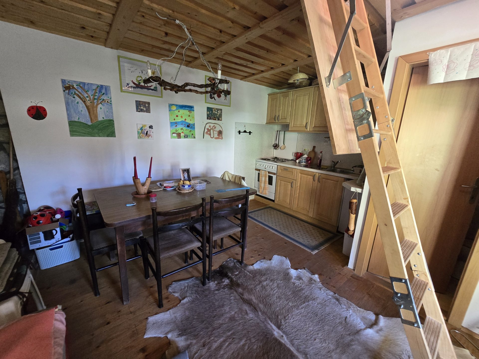 The old house has a bedroom with a rustic stove, a small dining room with a wood stove, a hall with a small kitchen, a bathroom and two cellars.