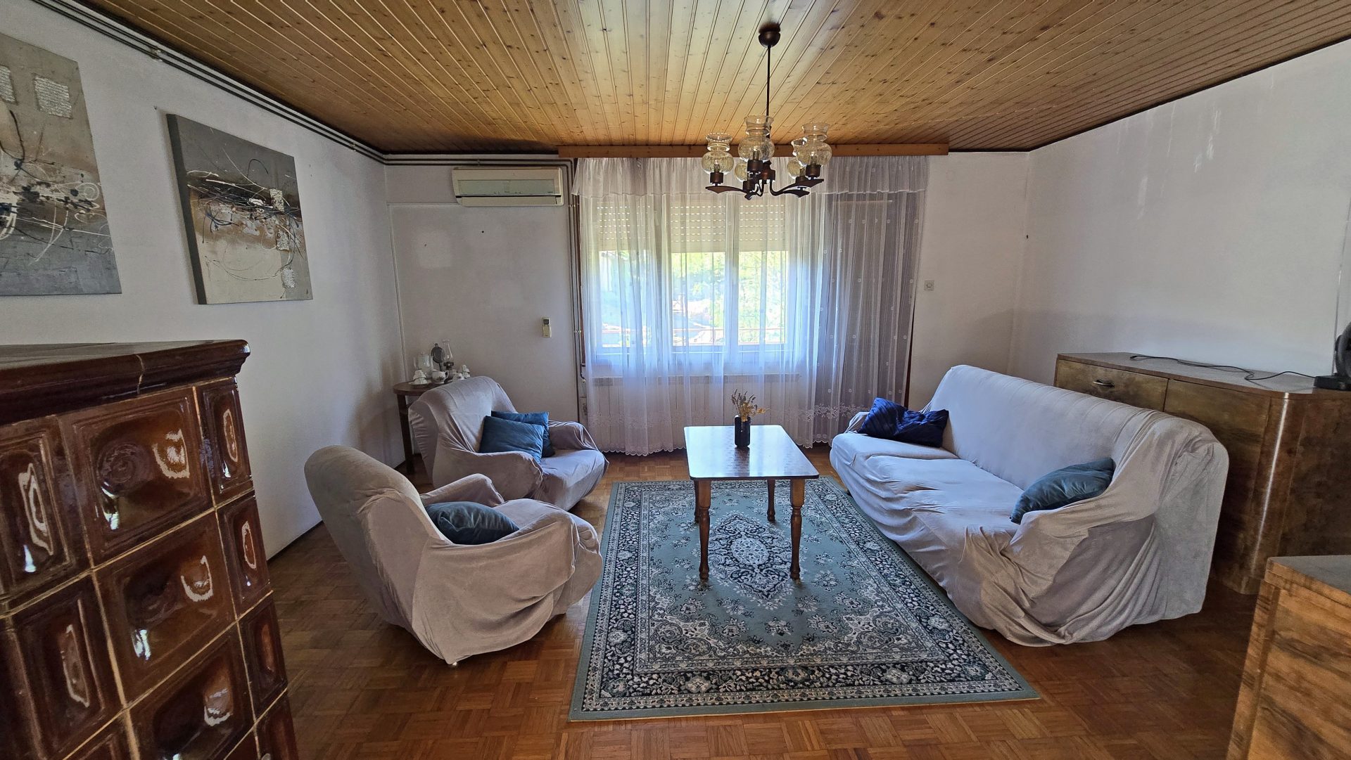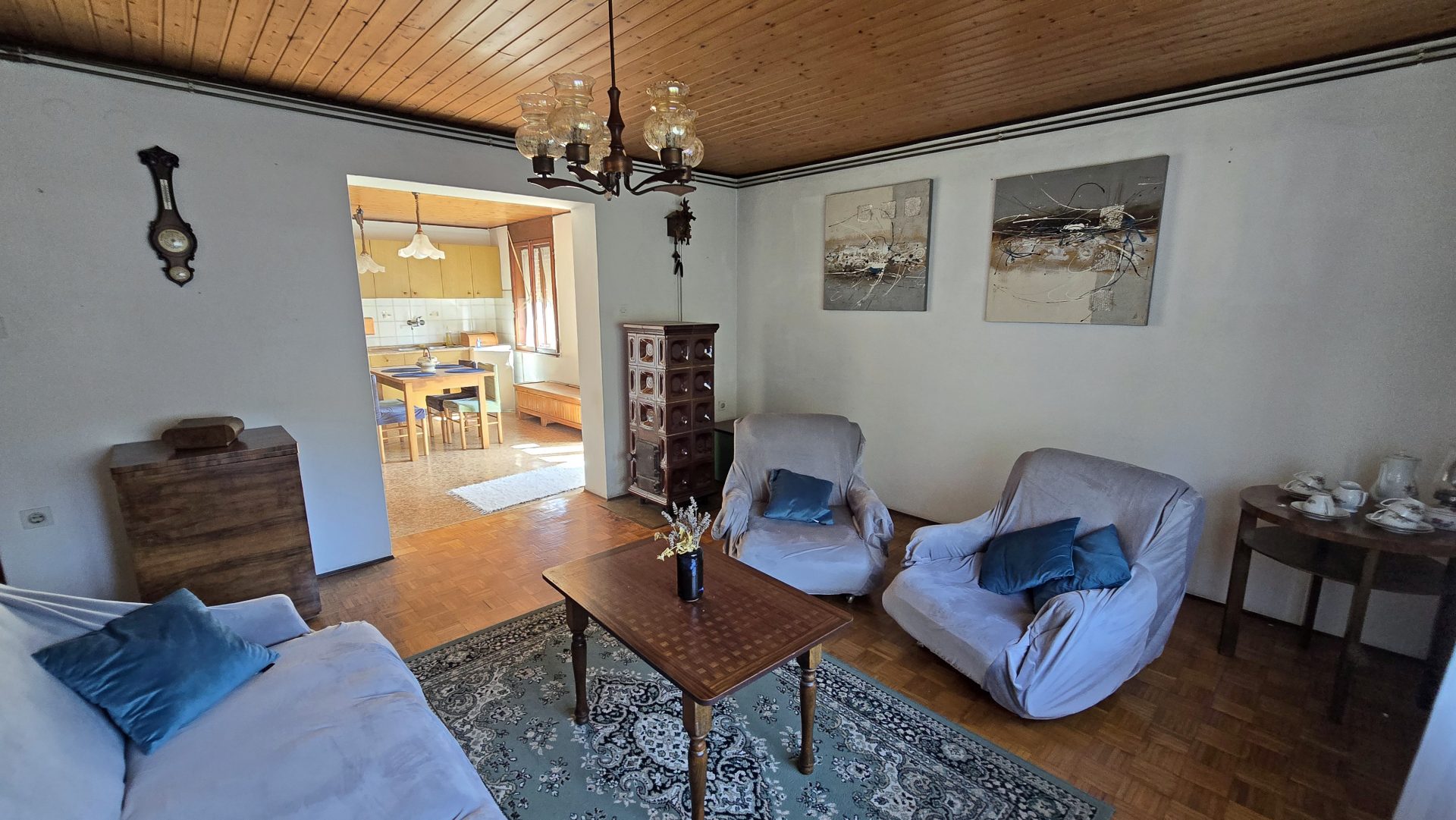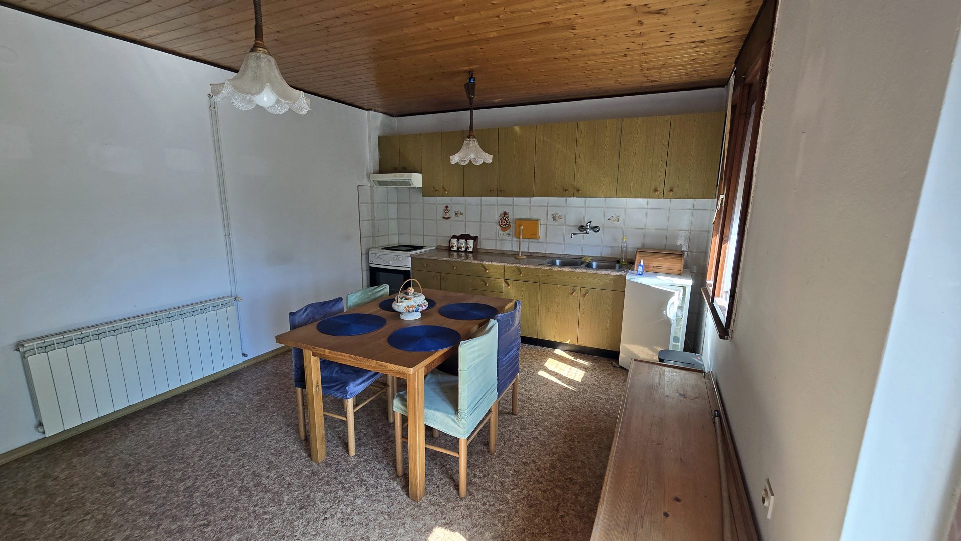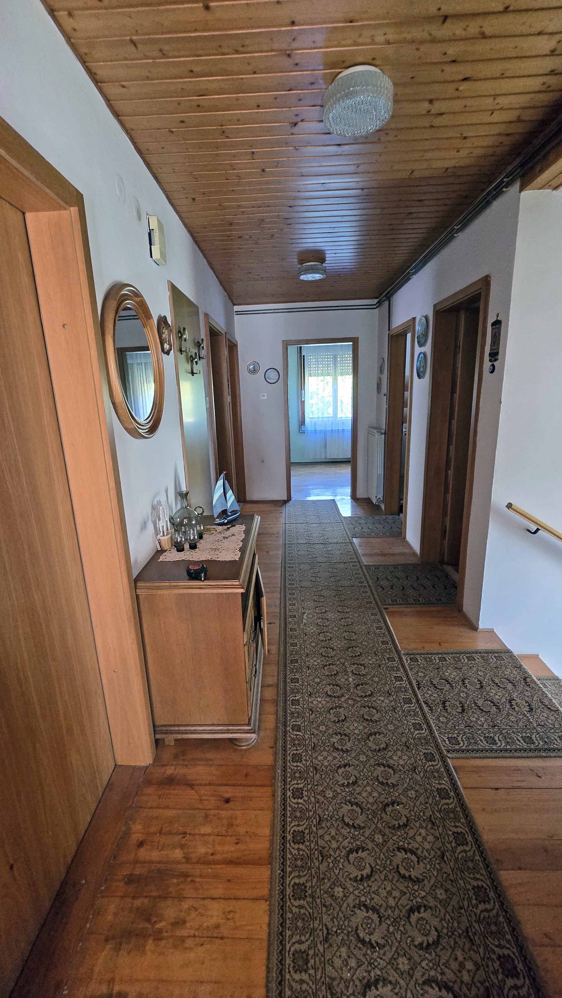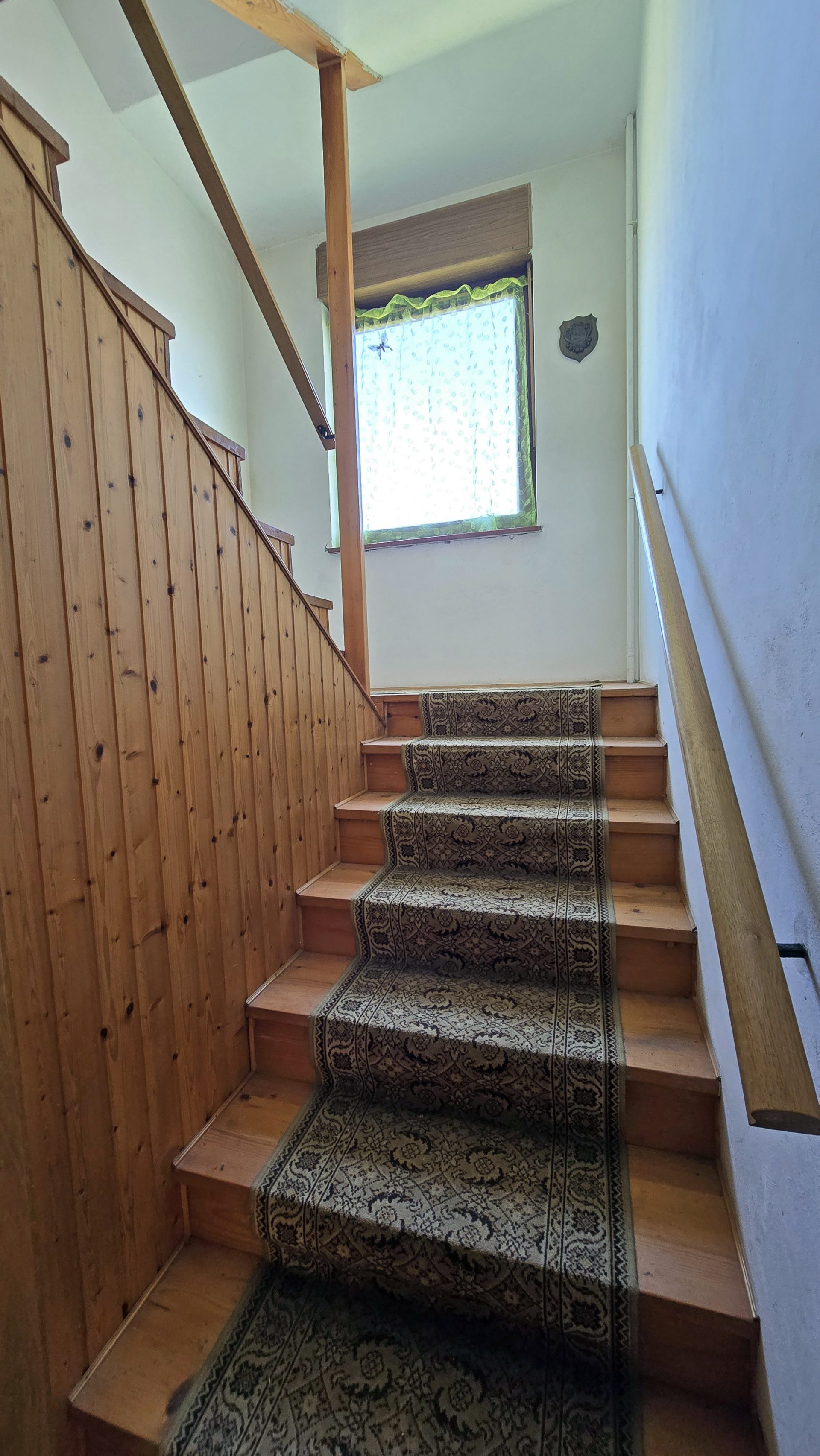 Stairs lead to the first floor where there is a large hallway connecting the rooms. On this floor there is a large and bright kitchen with a dining room and access to a large balcony, a living room with a ceramic stove, 3 bedrooms, a toilet and a bathroom.