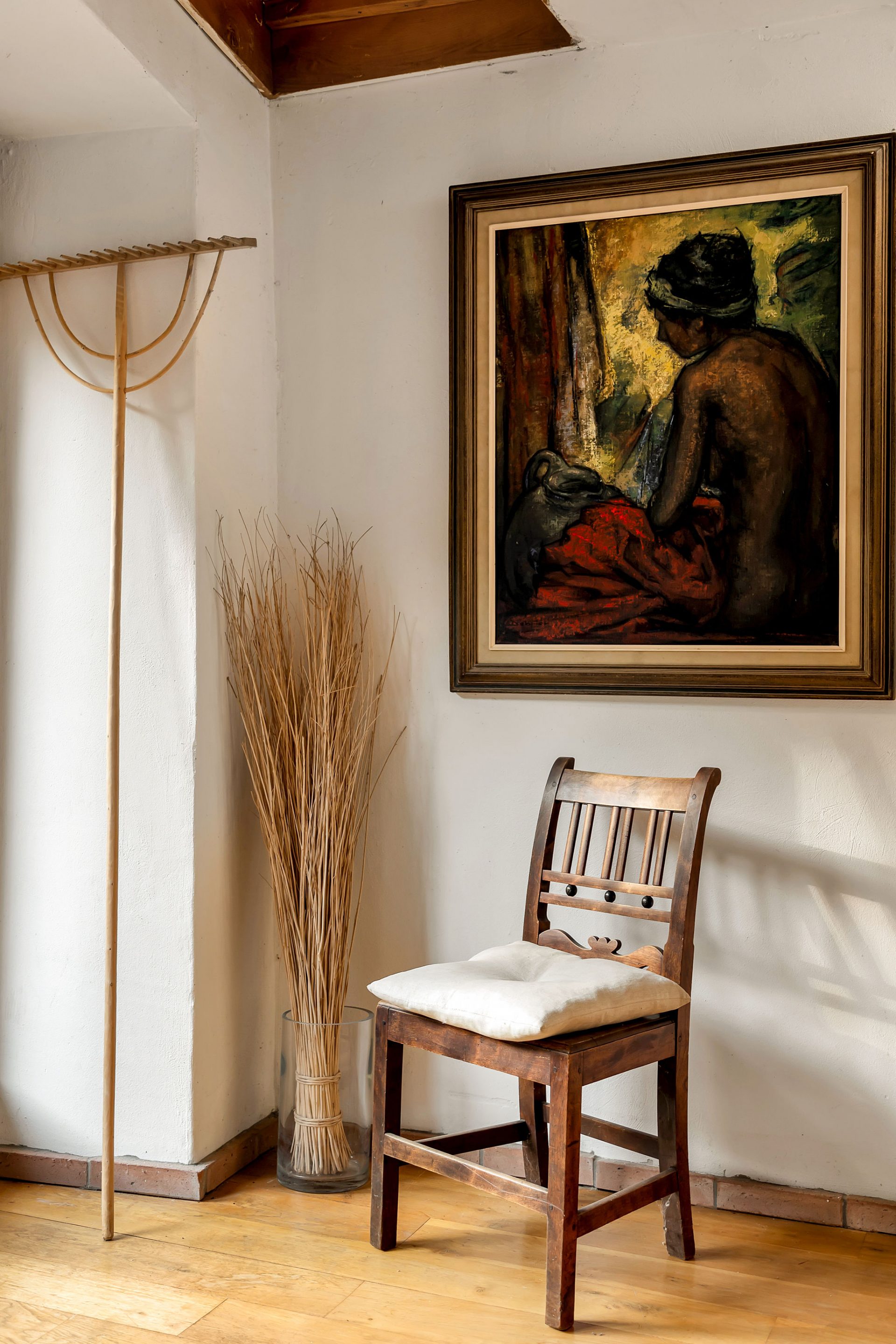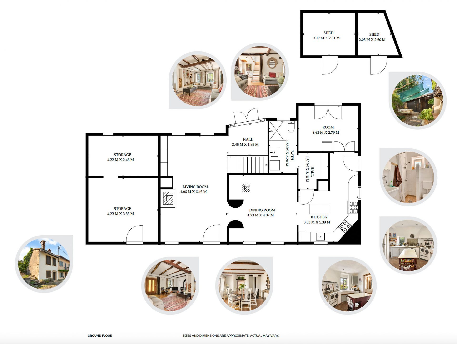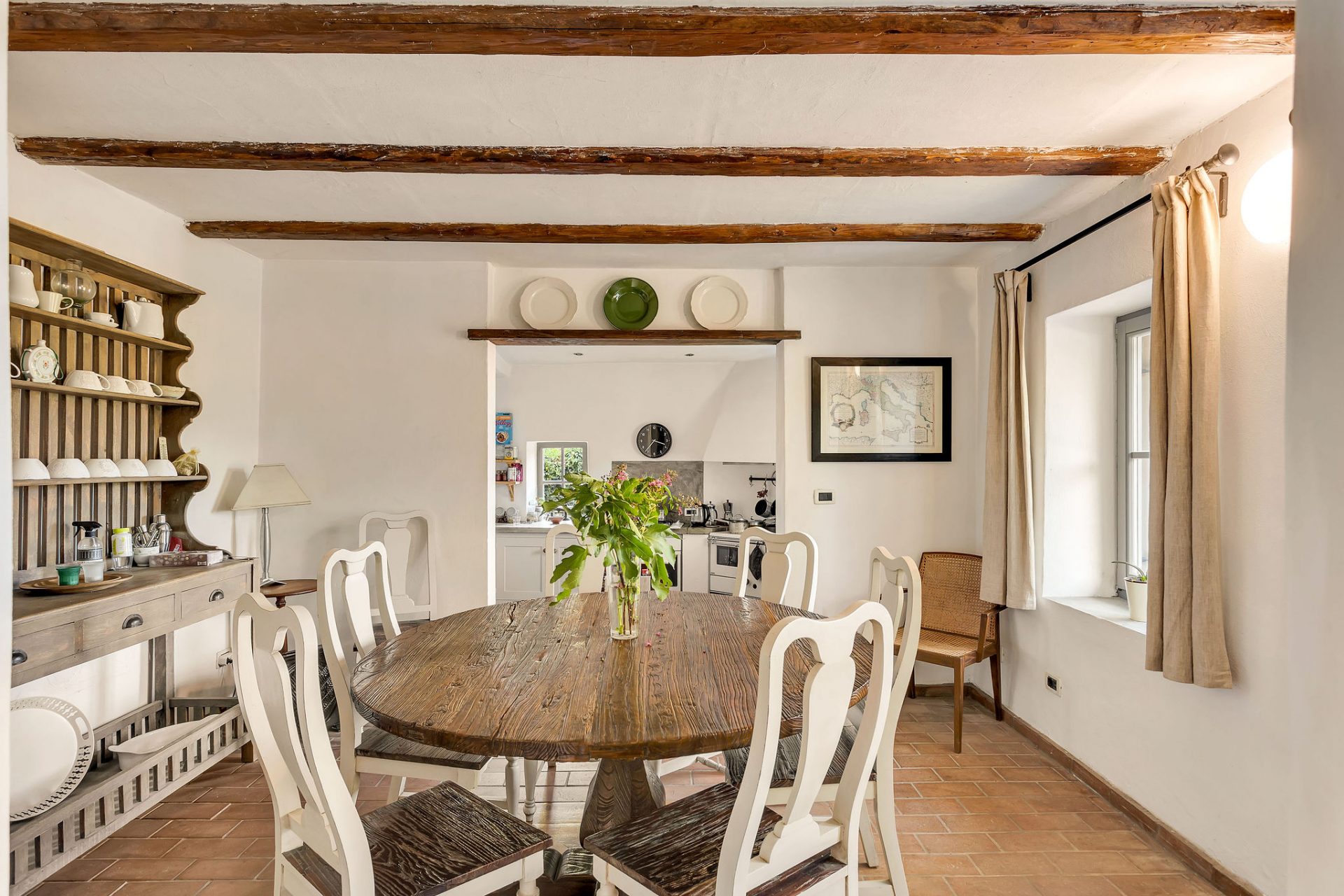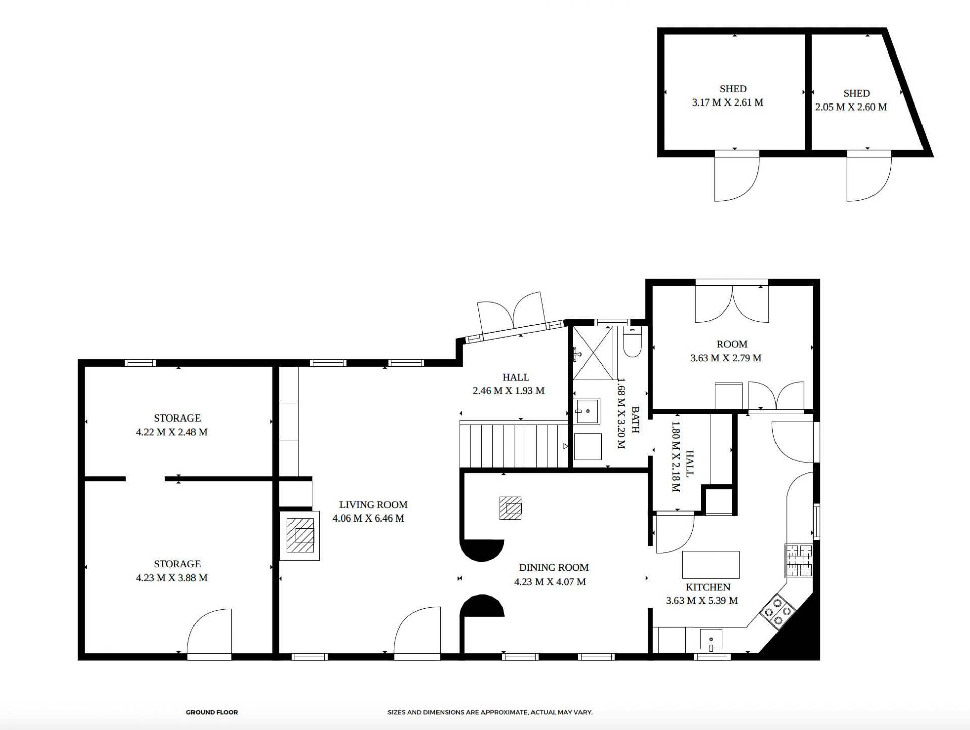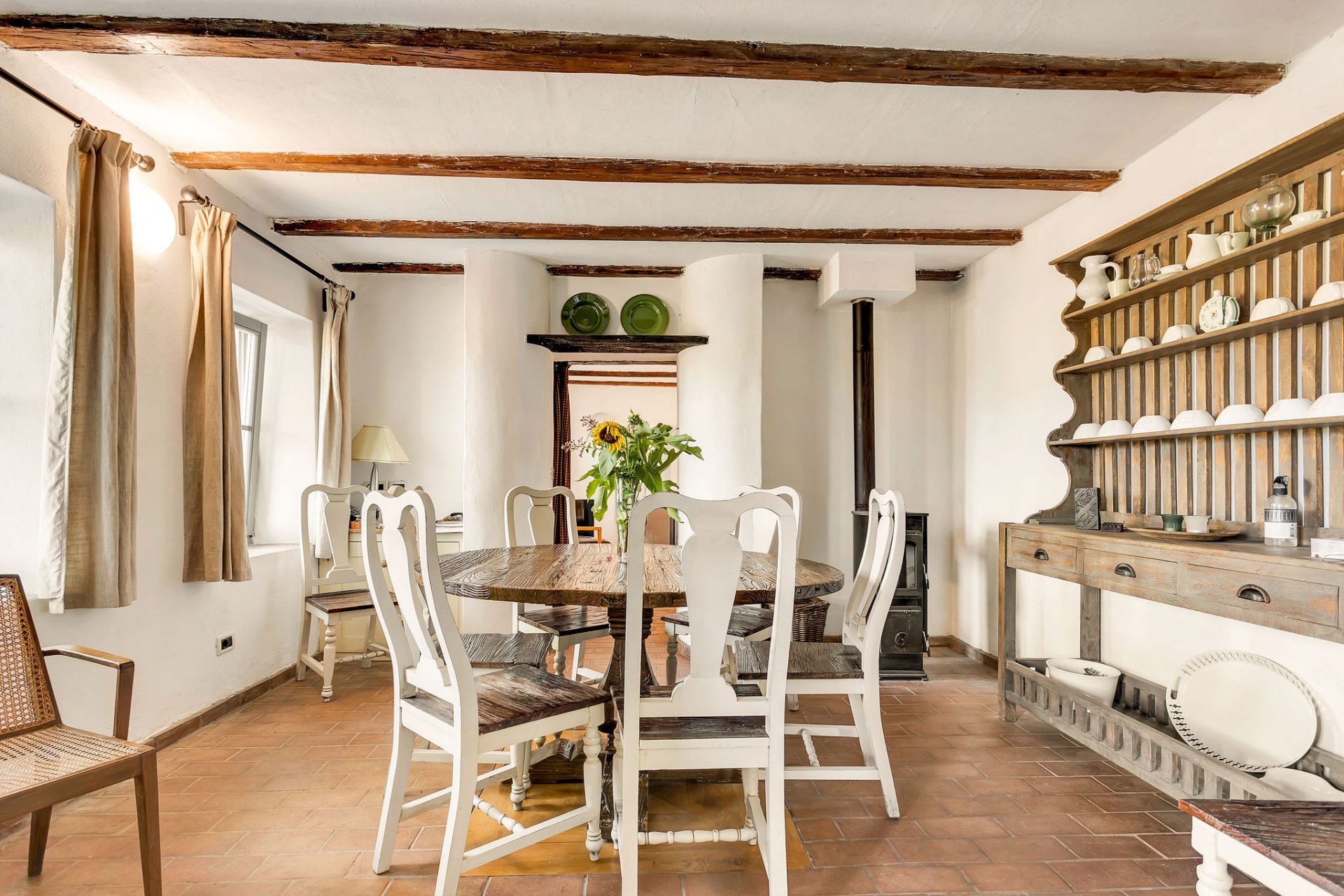 On the ground floor there is a large kitchen with old kitchen stove, a large dining room with a fireplace and access to outside, a bathroom, hallway and one room. There is also an additional hallway with staircase to the upper floor.