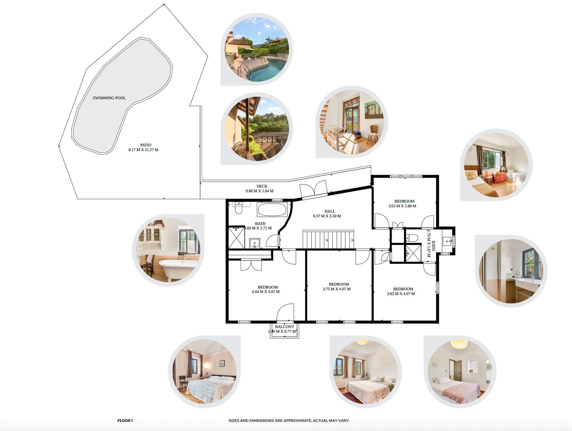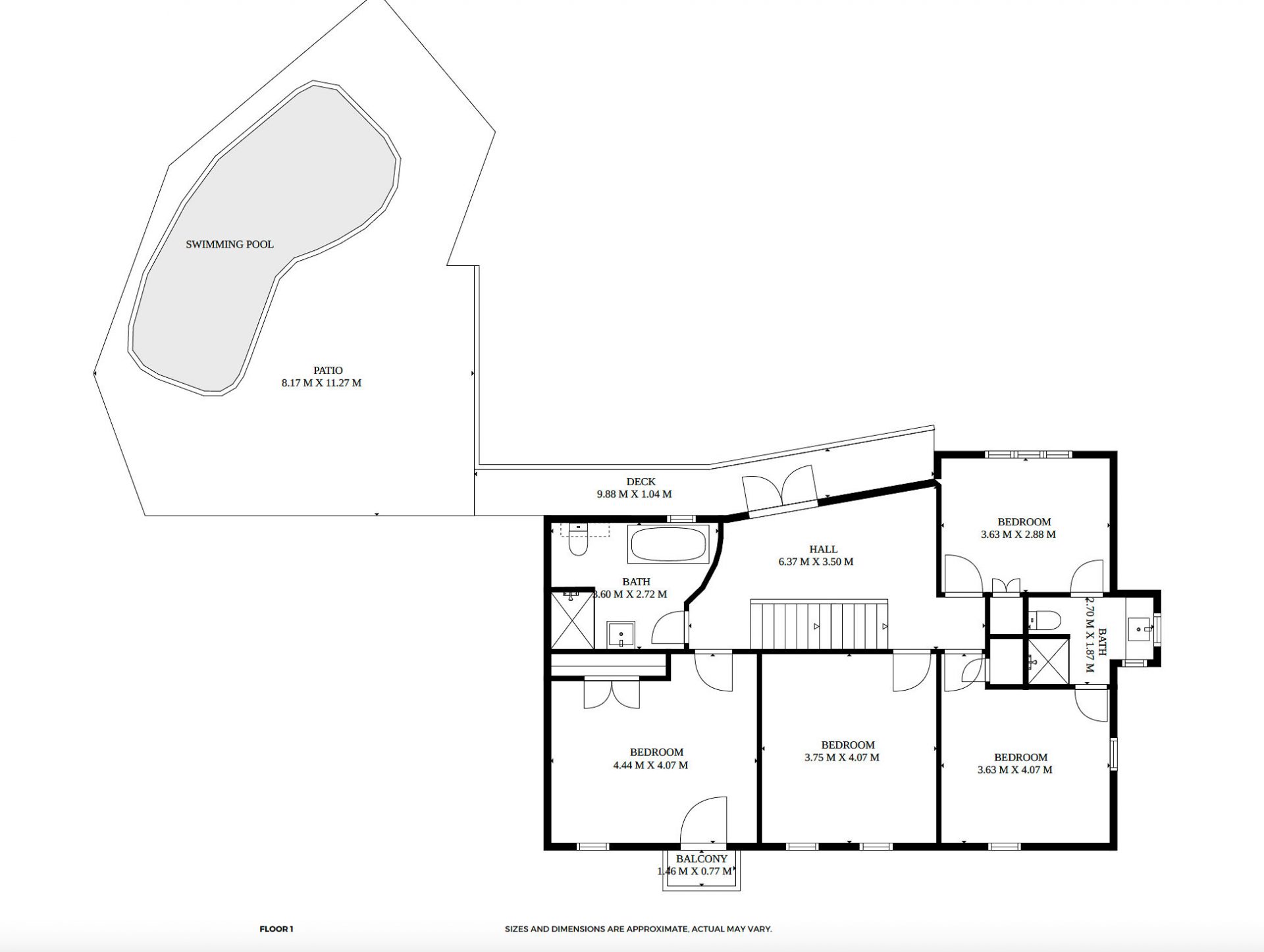 On the 1st floor, there is a spacious hallway, 4 bright bedrooms, toilet, bathroom, access to outside followed by a deck and swimming pool. There is a nice garden on the back of the house with swimming pool area. There is also a shed on the back with two storage rooms.