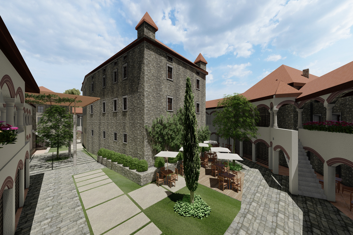 Центральная романская башня была тщательно восстановлена практически из руин и превратилась в могучее здание площадью 1440 м2, с каменными стенами, внушительной лестницей, новой крышей и напольными плитами. В этом здании можно создать роскошный отель с большими номерами, залом для завтраков, рекреационным комплексом, большой библиотекой и казино. Некоторые помещения в цокольном этаже могут быть использованы в качестве технических помещений или винных погребов.